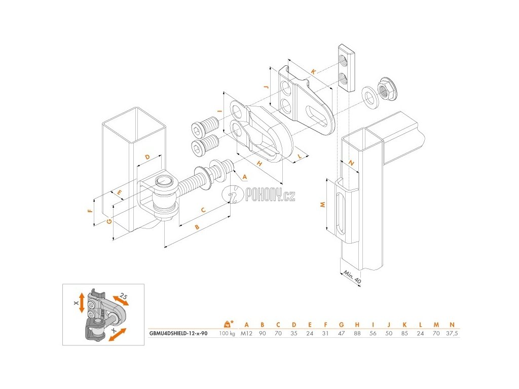 Závěs umožňuje regulaci 25 mm na šířku (X),.19 mm na výšku (Y) a 41 mm na hloubku (Z).