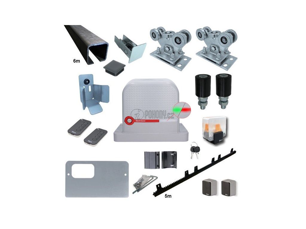 Kompletní sada pro výrobu samonosné posuvné brány s průjezdem max. 4,5m a hmotností max. 500kg, vybavená pohonem NICE RBS600HS KCE od předního výrobce kvalitní bránové automatizační techniky.