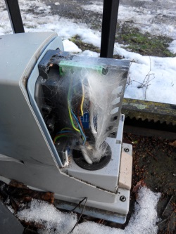 Stejně jako se občas zvedne víko motoru u auta a zkontroluje se, zda tam neřádila kuna, je potřeba občas zvednout i víko u pohonu vrat a podívat se, zda se nám tam něco neusídlilo, jako například zde :-)