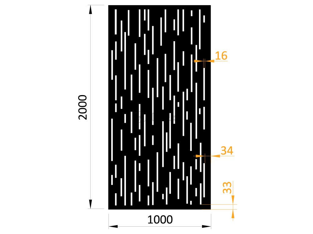 Moderní designová kovová výplň, laserem vypálený vzor 8312, rozměr 1000x2000x2,0 mm +/- 0,5%, výška výpalku 15,5 mm. Šířka okrajů bez výpalu je 35mm.