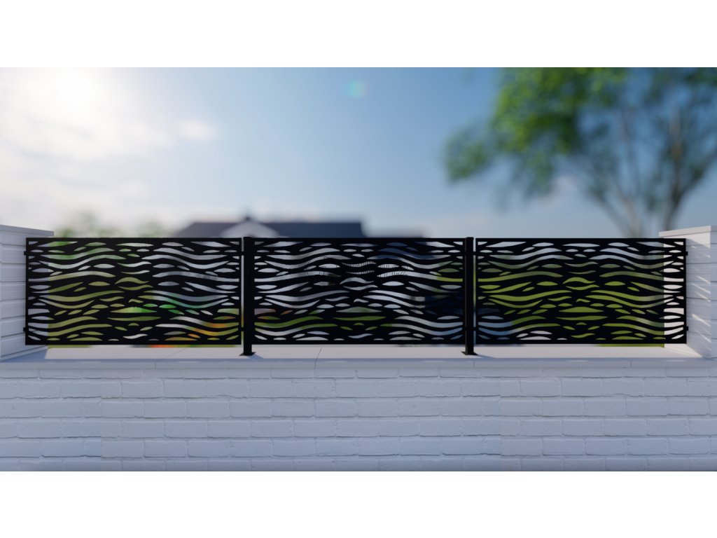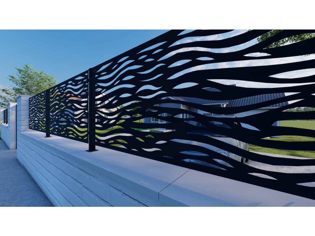 Moderní designová kovová výplň, laserem vypálený vzor 1019, rozměr 1000x2000x2,5 mm +/- 0,5%. Šířka okrajů bez výpalu je 35mm