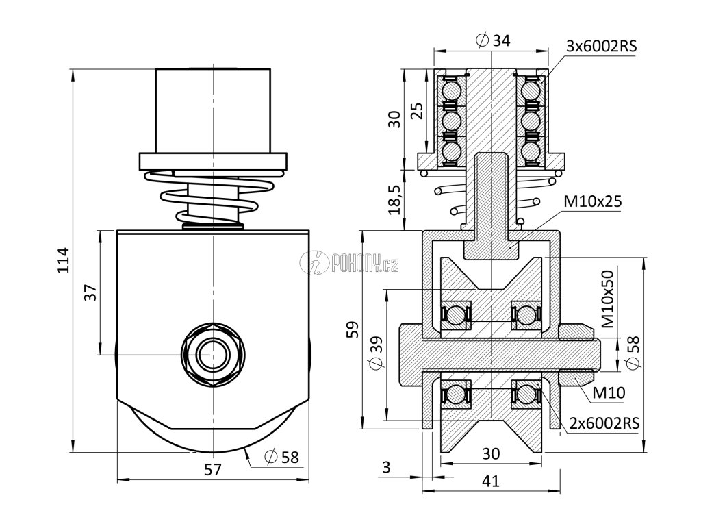Pojezdové otočné kolečko ø58mm s pružinou, U drážka ø20 mm pro kolejnicové obloukové brány