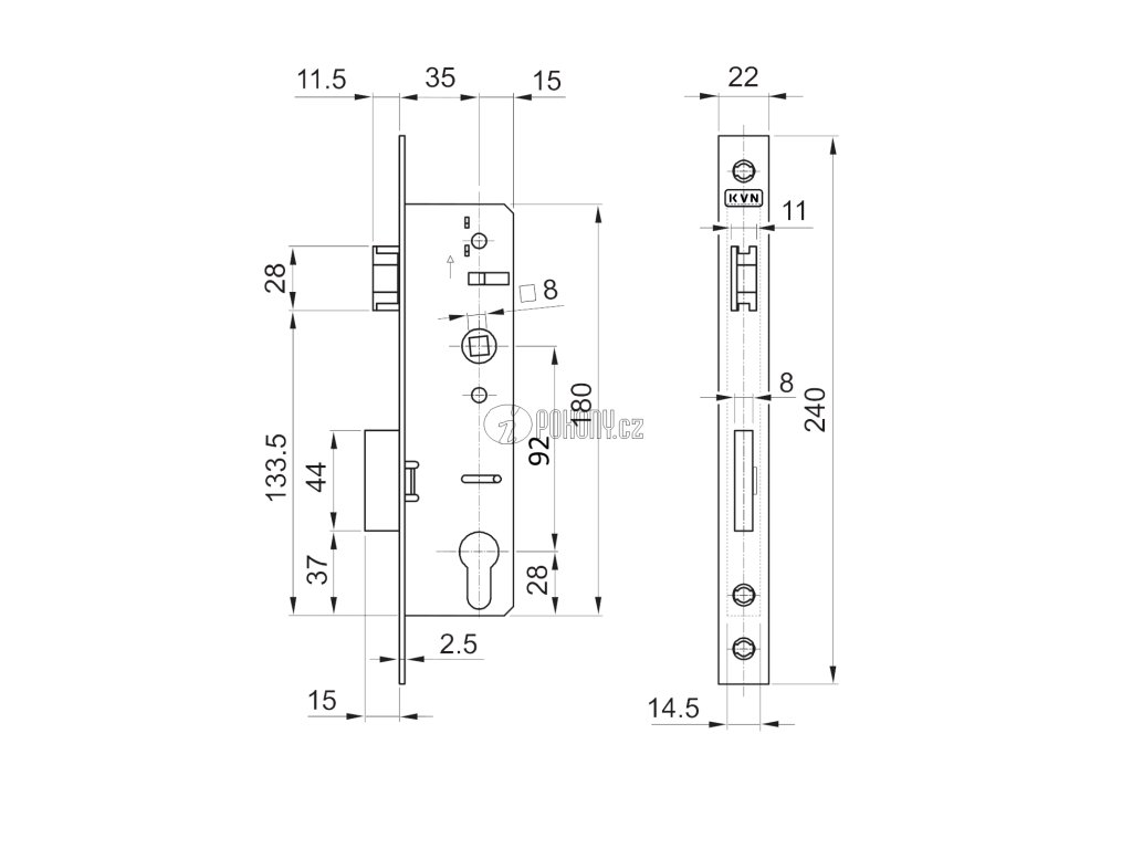 Zadlabávací oboustranný zámek s roztečí 92mm, hloubka 47,5mm