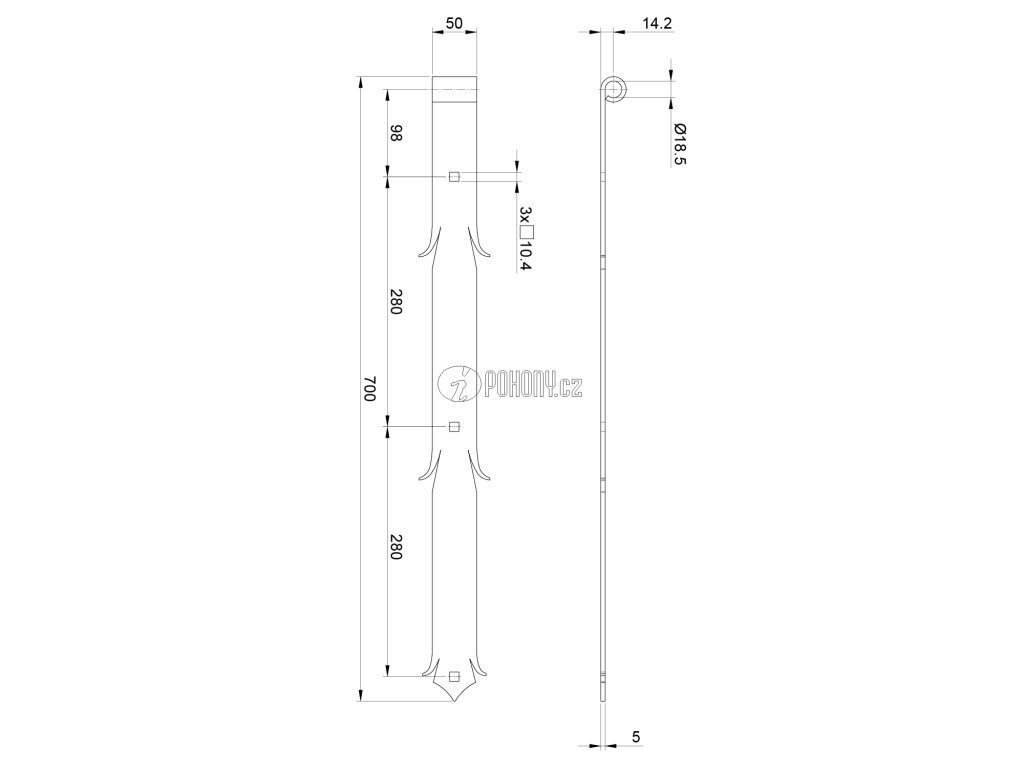 Kování ozdobné - pásový závěs 700 x 50 x 5 mm, povrch černý lak